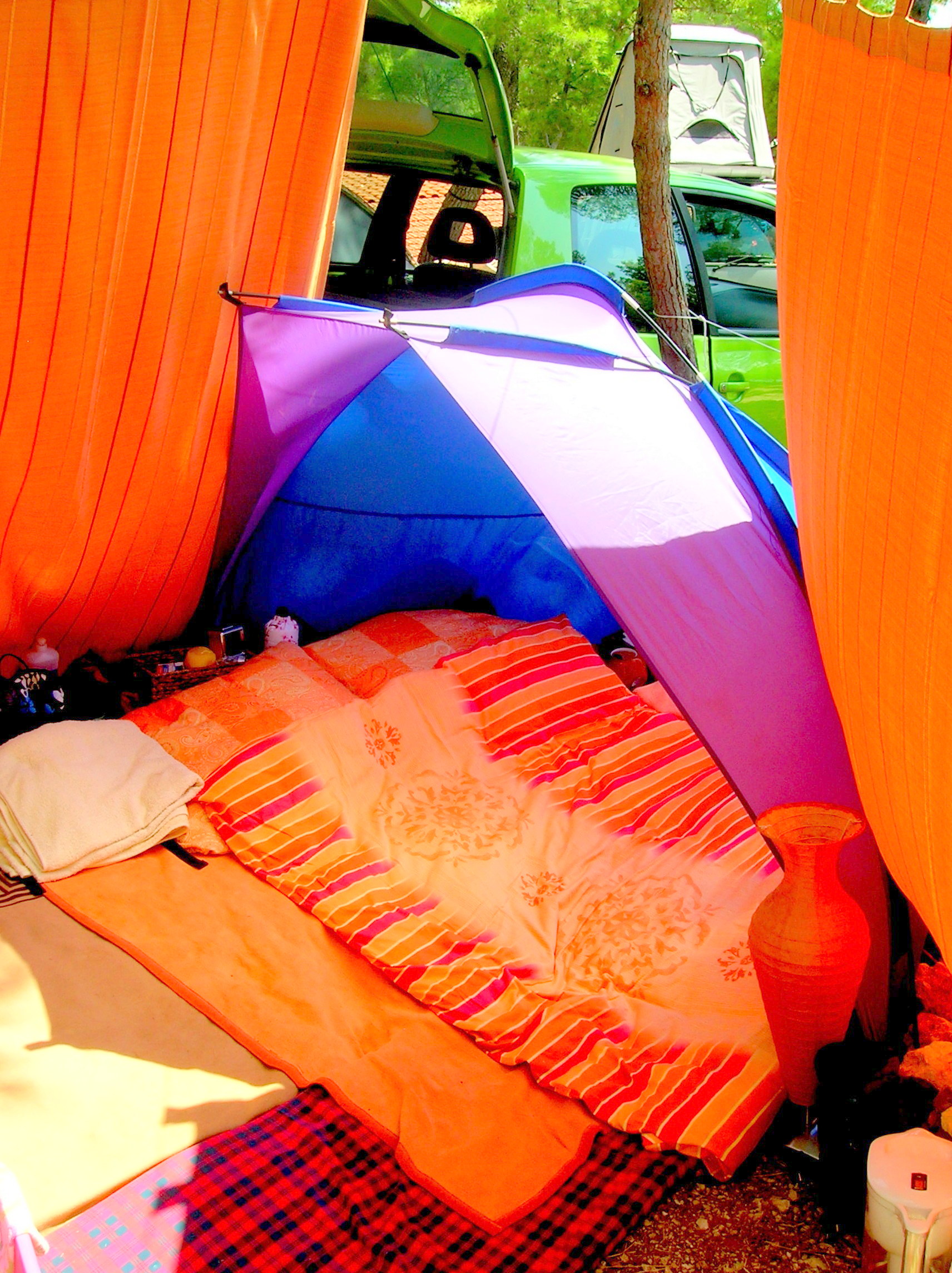 Um 8 Uhr aufgewacht, restlicher Aufbau zu zweit !!!...nicht so wie vor 3 Jahren, als Markus alles alleine machen wollte !...erstes Bad am FKK-Strand...So herrlich !!! Essen, 1 Stunde danach wieder runter zum Meer bis zum Abendessen...Schwelgen im Meer, Sonnenbaden und Lesen – erste Entgiftungs-Pickelchen - Angst, meine, etwas beweisen zu müssen – Botschaften: SEIN, so wie ich bin, kein Druck, auch viel Schmerz kommt hoch...dann Spaghetti mit selbstgemachtem Sataraš und Tomatensoße von Silvia – Köstlich! - und Gurkensalat...Kalt duschen und gemeinsames Schlafen in der Strandmuschel...gegen Morgen Schnakenalarm...immer wieder Ängste, Herz reagiert massiv...Klare Botschaften und Beruhigung durch die geistige Welt...Tag 6 Freitag – Tag 2 Hvar