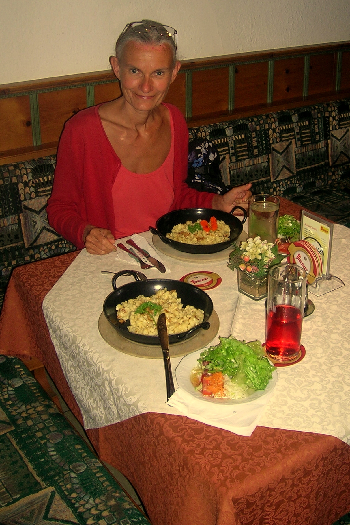 Wir gehen ins Campingplatz-Restaurant und rechnen zusammen, was wir uns mit unseren Kunas noch bestellen können. Wir bestellen uns gegrilltes Gemüse, Pommes mit Mayo und einen gemischten Salat - dazu gibt es dann noch Brot – und teilen alles miteinander. Es fehlen einige Kunas, damit Markus sich etwas zu trinken bestellen kann. Georg, der mit seiner Familie auch da ist, tauscht Markus noch 10 Kunas um, sodaß das Geld auch dafür reicht. Leider gibt es keinen Palatschinken mit Eis mehr, aber dafür essen wir dann so jeder noch eine Riesenkugel Eis und werden gut satt mit dem Essen. Wir kommen dann noch mit dem kroatischen Freund zweier Facebook-Freunde von uns ins Gespräch, der Häuser auf Hvar und anderswo verkauft und vermittelt. Er meint, wir sollten auf keinen Fall nach Slowenien ziehen, sondern im Osten von Zagreb ein Haus kaufen. Wir sind uns anschließend aber einig, daß dies für uns nicht infrage kommt und unsere Entscheidung goldrichtig ist für uns, da wir uns ein individuelles Häuschen selbst bauen wollen, und zwar in Metlika...